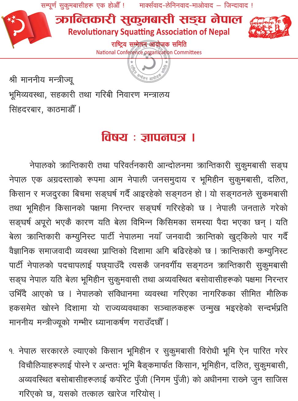 ज्ञापनपत्रमा भनिएको छ, ‘नेपालको क्रान्तिकारी तथा परिवर्तनकारी आन्दोलनमा क्रान्तिकारी सुकुमबासी सङ्घ नेपाल एक अग्रदस्ताको रूपमा आम नेपाली जनसमुदाय र भूमिहीन सुकुमबासी, दलित, किसान र मजदुरका बिचमा सङ्घर्ष गर्दै आइरहेको सङ्गठन हो । यो सङ्गठनले सुुकमबासी तथा भूमिहीन किसानको पक्षमा निरन्तर सङ्घर्ष गरिरहेको छ । नेपाली जनताले गरेको सङ्घर्ष अपूरो भएकै कारण यति बेला विभिन्न किसिमका समस्या पैदा भएका छन् । यति बेला क्रान्तिकारी कम्युनिस्ट पार्टी नेपालमा नयाँ जनवादी क्रान्तिको खुट्किलो पार गर्दै वैज्ञानिक समाजवादी व्यवस्था प्राप्तिको दिशामा अगि बढिरहेको छ । क्रान्तिकारी कम्युनिस्ट पार्टी नेपालको पदचापलाई पछ्याउँदै त्यसकै जनवर्गीय सङ्गठन क्रान्तिकारी सुकुमबासी सङ्घ नेपाल यति बेला भूमिहीन सुकुमवासी तथा अव्यवस्थित बसोवासीहरूको पक्षमा निरन्तर उभिँदै आएको छ । नेपालको संविधानमा व्यवस्था गरिएका नागरिकका सीमित मौलिक हकसमेत खोस्ने दिशामा यो राज्यव्यवथाका सञ्चालकहरू उन्मुख भइरहेको सन्दर्भप्रति माननीय मन्त्रीज्यूको गम्भीर ध्यानाकर्षण गराउँदछौँ ।