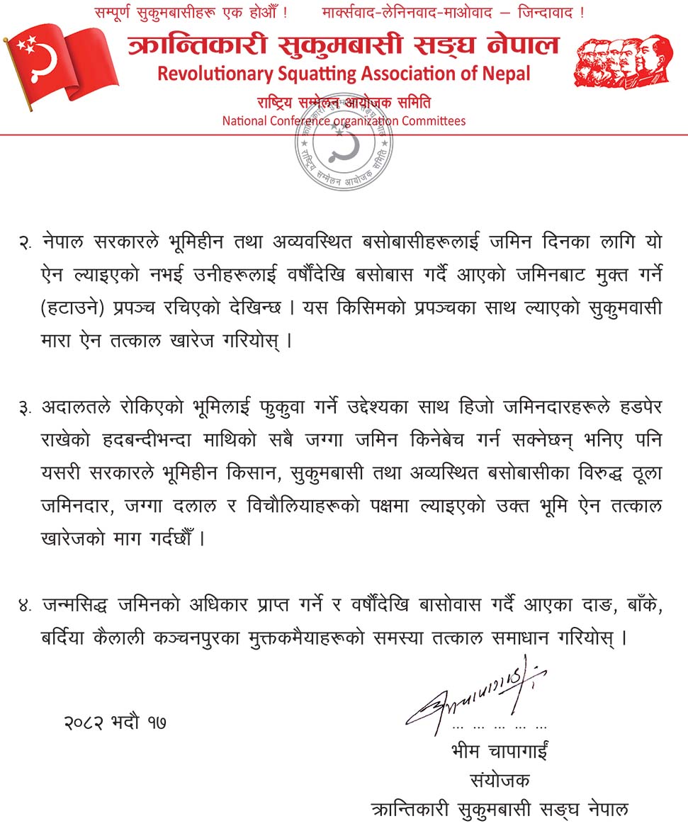 मङ्गलबार क्रान्तिकारी कम्युनिस्ट पार्टी नेपाल निकट क्रान्तिकारी सुकुमबासी संघ नेपाल राष्ट्रिय सम्मेलन आयोजक समितिका संयोजक भीम चापागाईंद्वारा हस्ताक्षरित ज्ञापनपत्र बुझाइएको हो ।