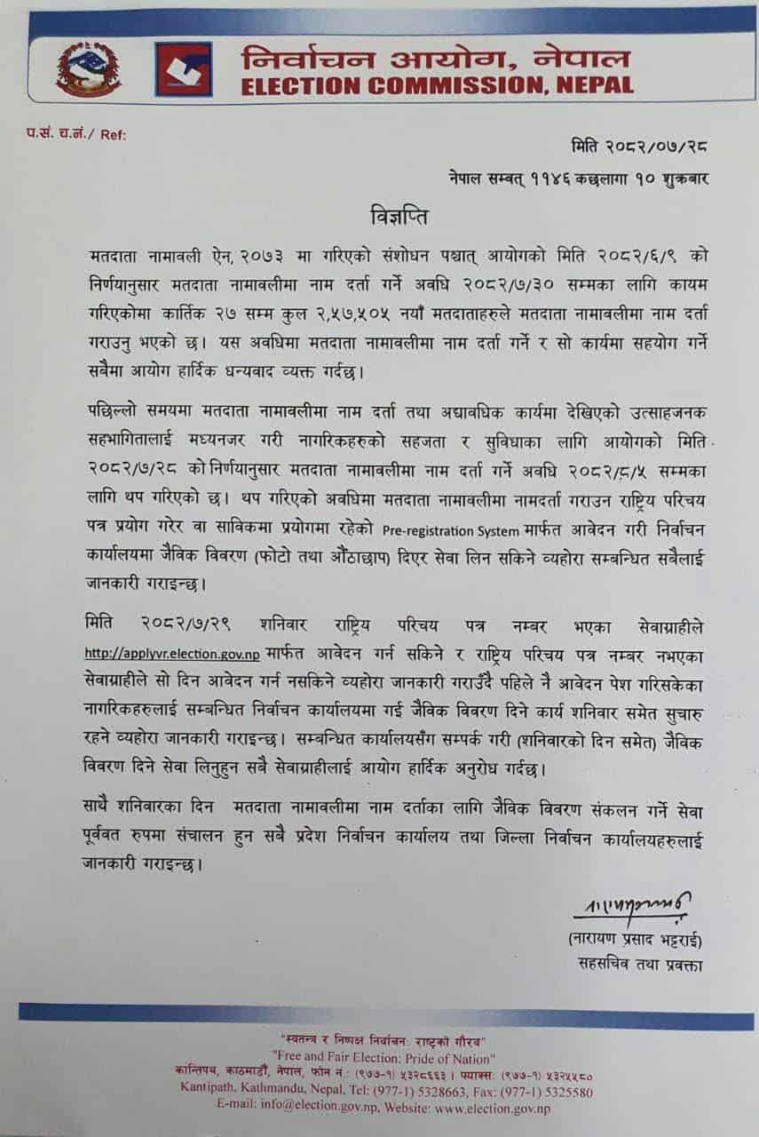 थप गरिएको अवधिमा मतदाता नामावलीमा नाम दर्ता गराउन राष्ट्रिय परिचय पत्र प्रयोग गरेर वा साविकमा प्रयोगमा रहेको प्रि रजिस्ट्रेसन सिस्टममार्फत आवेदन गर्न सकिने आयोगले जनाएको छ ।