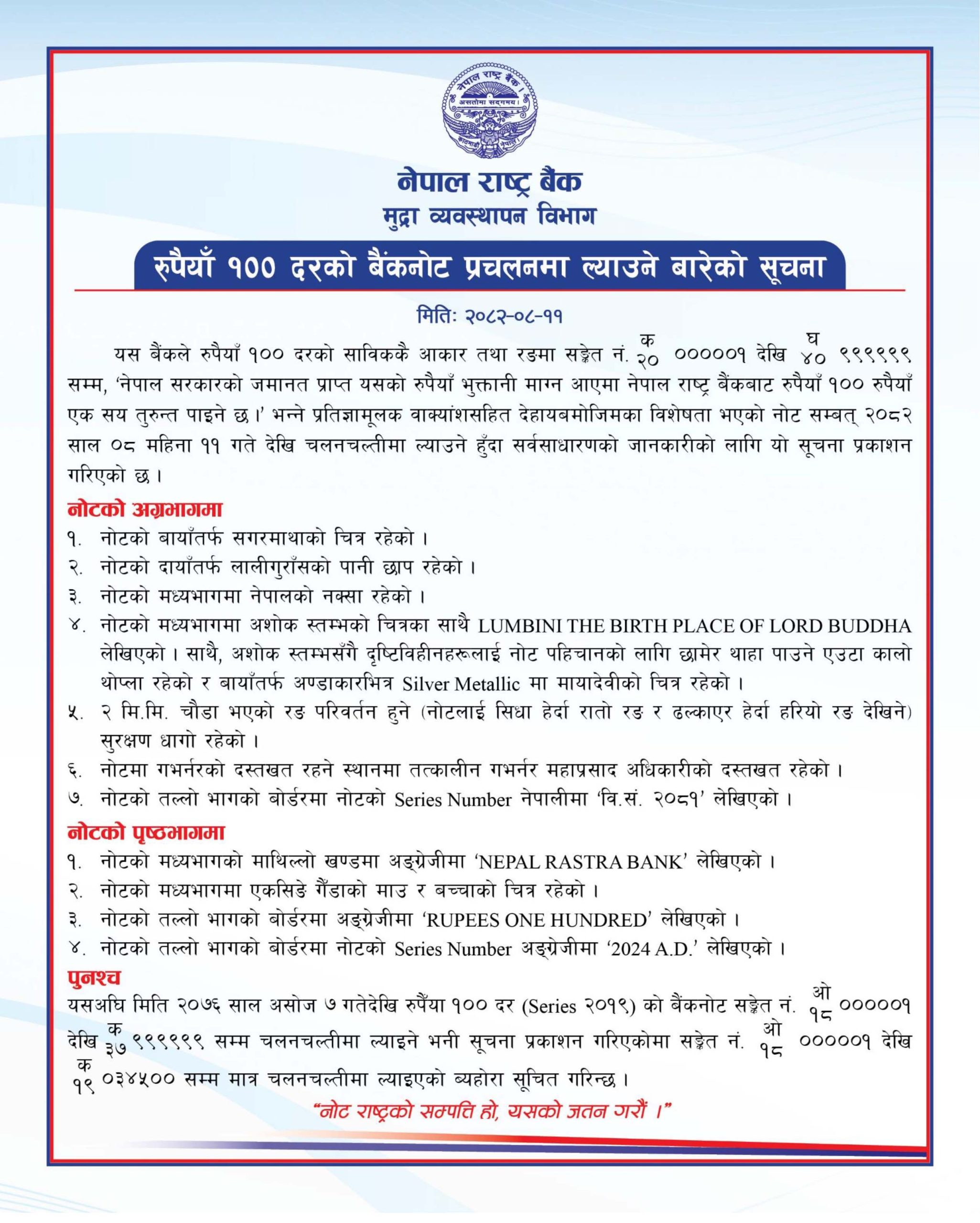 मङ्सिर ११, काठमाडौँ । नेपाल राष्ट्र बैंकले आजदेखि एक सय रुपैयाँ दरको नयाँ नोट प्रचलनमा ल्याएको छ । बैंकले आज एक सूचना जारी गर्दै नयाँ विशेषतासहितको नोट चलनचल्तीमा ल्याएको जनाएको छ ।
