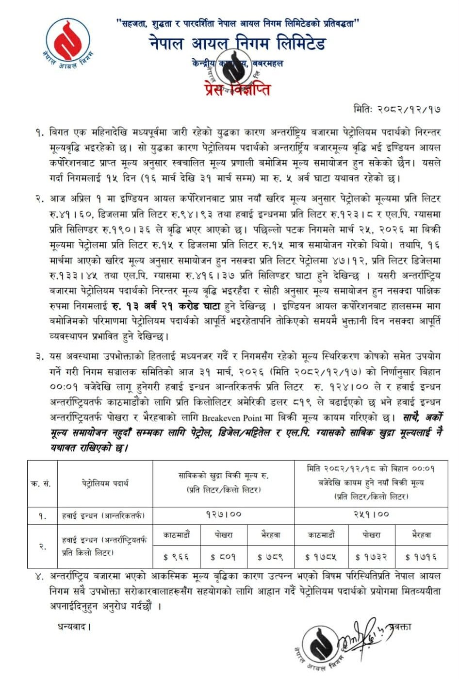 चैत १८, काठमाडौँ । मध्यपूर्वमा जारी द्वन्द्वका कारण अन्तर्राष्ट्रिय बजारमा पेट्रोलियम पदार्थको मूल्य निरन्तर बढिरहेको छ । मङ्गलबार राति १२ बजेपछि लागू हुने गरी पेट्रोल, डिजेल, मट्टितेल र खाना पकाउने एलपी ग्यासको मूल्य यथावत् राखी हवाई इन्धनको मूल्य बढाइएको निगमले जनाएको छ ।