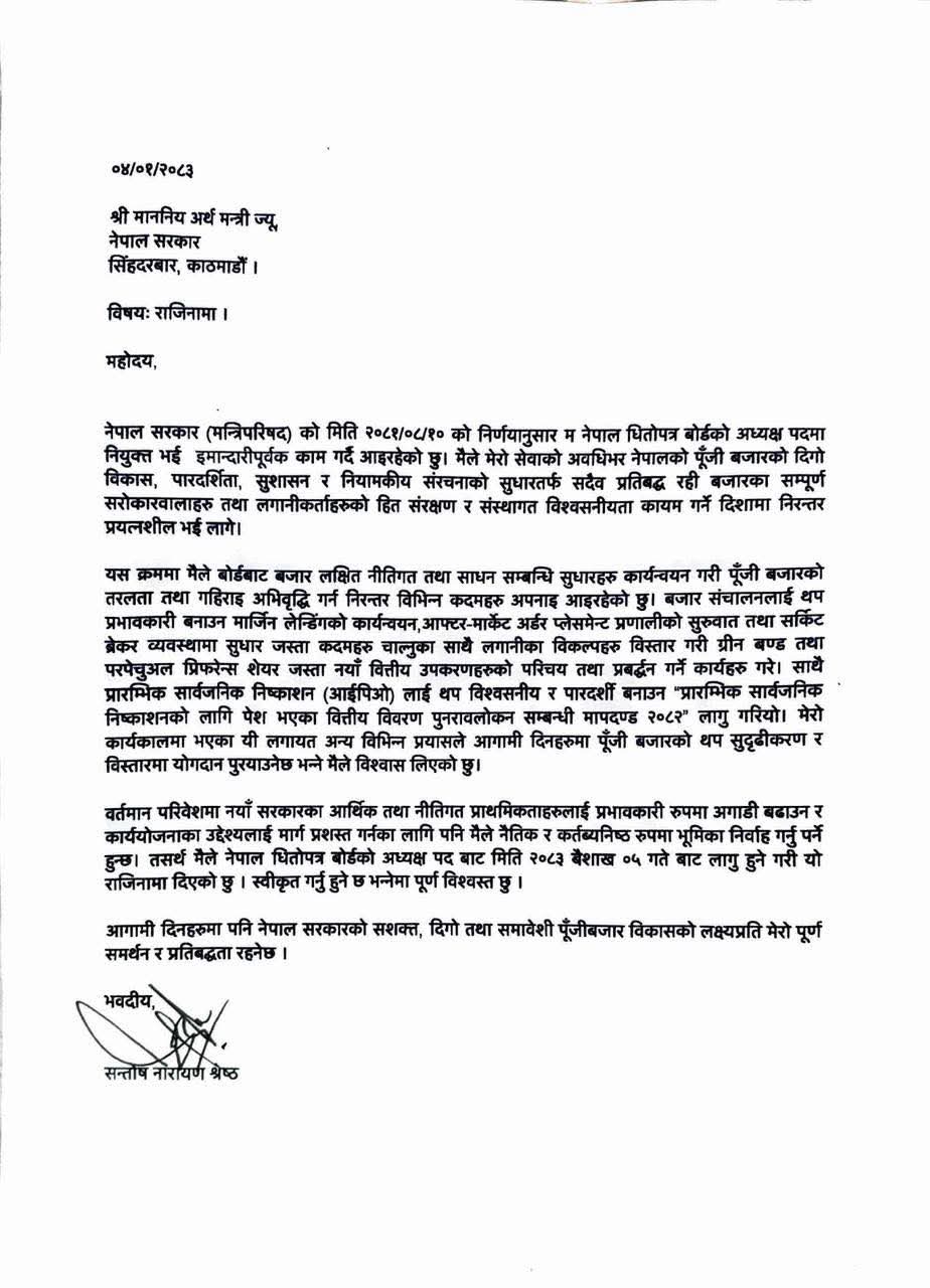 धितोपत्र ऐनअनुसार अध्यक्षले राजीनामा सरकारसमक्ष बुझाउनुपर्ने व्यवस्था अनुसार श्रेष्ठले शनिबार अर्थमन्त्रीसमक्ष औपचारिक रूपमा राजीनामा दिने जानकारी दिएका छन् ।